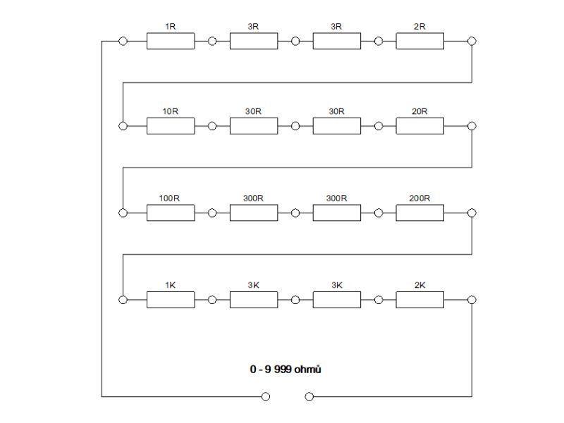 Na obrázcích je pro zjednodušení naznačena dekáda složená jenom ze čtyř řad (takže jednotky, desítky, stovky Ω a jednotky kiloohm). Řady vyšších hodnot jsou samozřejmě udělané stejně. Pro dekádu v rozsahu 1 Ohm - 10 MΩ nám tedy místo šedesáti zdířek bude stačit jenom polovička. Rezistorů ušetříme ještě víc. Jestliže si zdířky očíslujeme a na dekádu nalepíme tabulku s údaji, které zdířky je třeba propojit pro získání dané hodnoty, nebude nám sestavování potřebných hodnot v praxi působit nějaké větší obtíže. Díky zvolenému uspořádání (1-3-3-2) stačí pro nastavení jakékoliv hodnoty v jedné řadě jenom jeden zkratovací kablík. Pro celou dekádu nám tedy postačí šest kablíků.